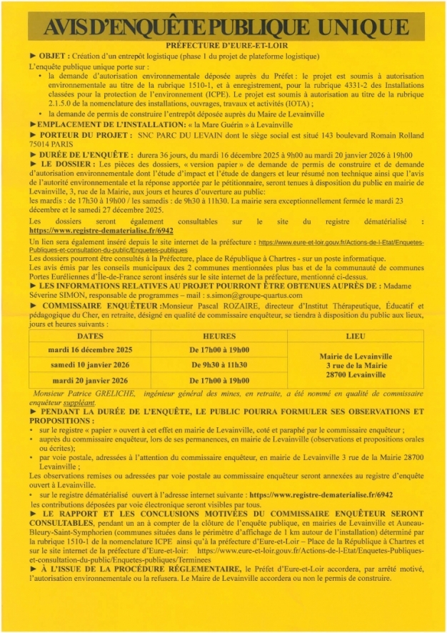 Dossier papier et registre d'enquête papier sont disponibles à la mairie de Levainville (3 rue de la Mairie les mardis de 17h30 à 19h00 et les samedis de 9h30 à 11h30 (exceptés le mardi 23 décembre et le samedi 27 décembre 2025).