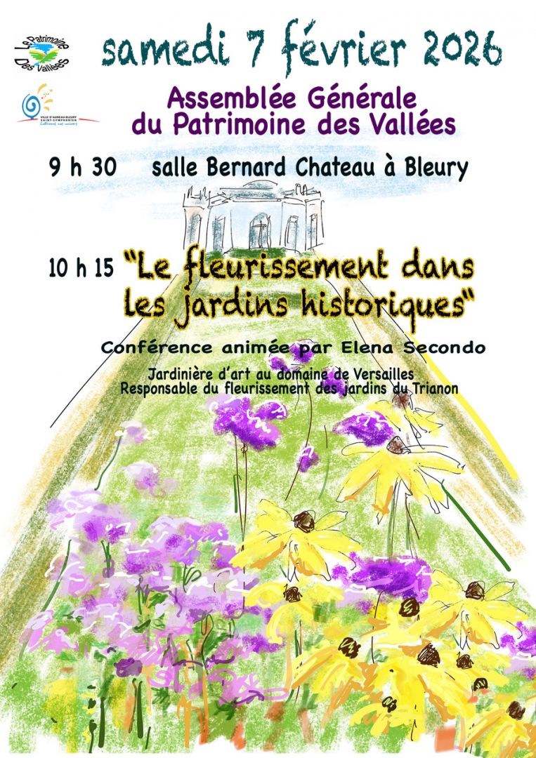 Evènements Assemblée Générale du Patrimoine des Vallées - Samedi 7 février Assemblée Générale du Patrimoine des Vallées - Samedi 7 février Auneau 0 Oui 0 € https://www.ville-ab2s.fr/fr/evenements/assemblee-generale-du-patrimoine-des-vallees-samedi-7-fevrier-790.html 07/02/2026 L'association du Patrimoine des Vallées tient son Assemblée Générale le samedi 7 février à partir de 9h30 à l'Espace Bernard Chateau de Bleury. À 10h15 conférence "Le fleurissement dans les jardins historiques" animée par Elena Secondo.
