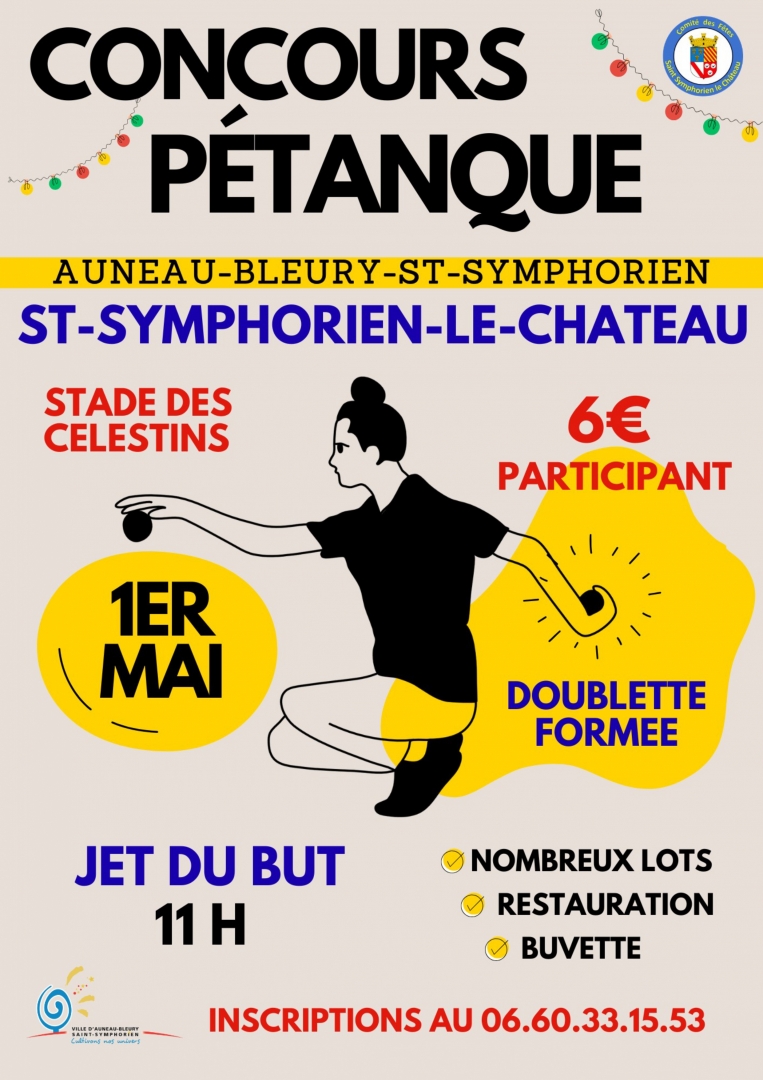 Evènements Concours de pétanque - Vendredi 1er mai à partir de 11h Concours de pétanque - Vendredi 1er mai à partir de 11h Auneau 0 Oui 0 € https://www.ville-ab2s.fr/fr/evenements/concours-de-petanque-vendredi-1er-mai-a-partir-de-11h-824.html 01/05/2026 Le Comité des Fêtes de Saint-Symphorien-le-Château organise un concours de pétanque le vendredi 1er mai sur le stade du gymnase Les Célestins. Nombreux lots à gagner. Restauration et buvette sur place. Inscriptions : 06 60 33 15 53