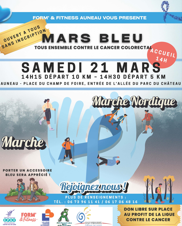 L'association Form' & Fitness Auneau propose l'événement "Mars Bleu - Tous ensemble contre le cancer colorectal" samedi 21 mars à partir de 14h15.