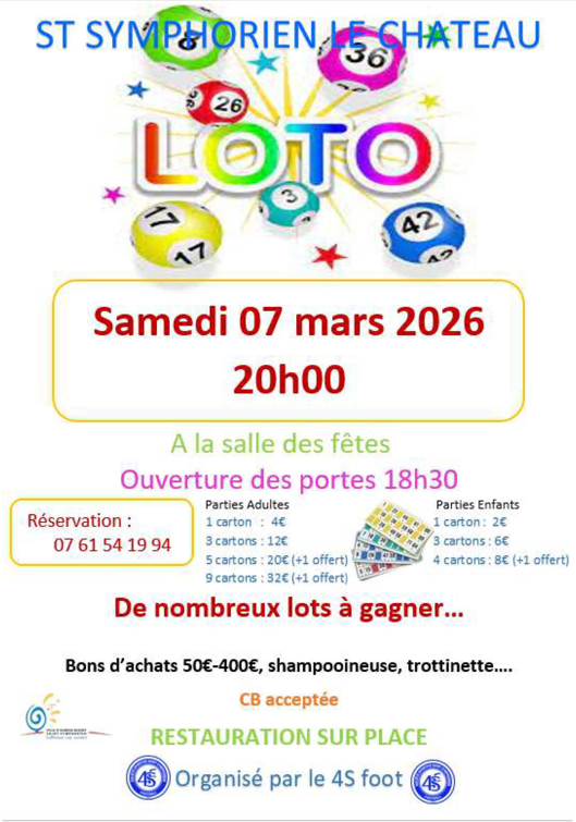 Evènements Loto du 4S Foot samedi 7 mars à 20h Loto du 4S Foot samedi 7 mars à 20h Auneau 0 Oui 0 € https://www.ville-ab2s.fr/fr/evenements/loto-du-4s-foot-samedi-7-mars-a-20h-791.html 07/03/2026 Le 4s foot organise un loto le samedi 7 mars à 20h à la Salle Patton de Saint-Symphorien. Ouverture des portes à 18h30. De nombreux lots à gagner. Restauration sur place. Réservation : 07 61 54 19 94
