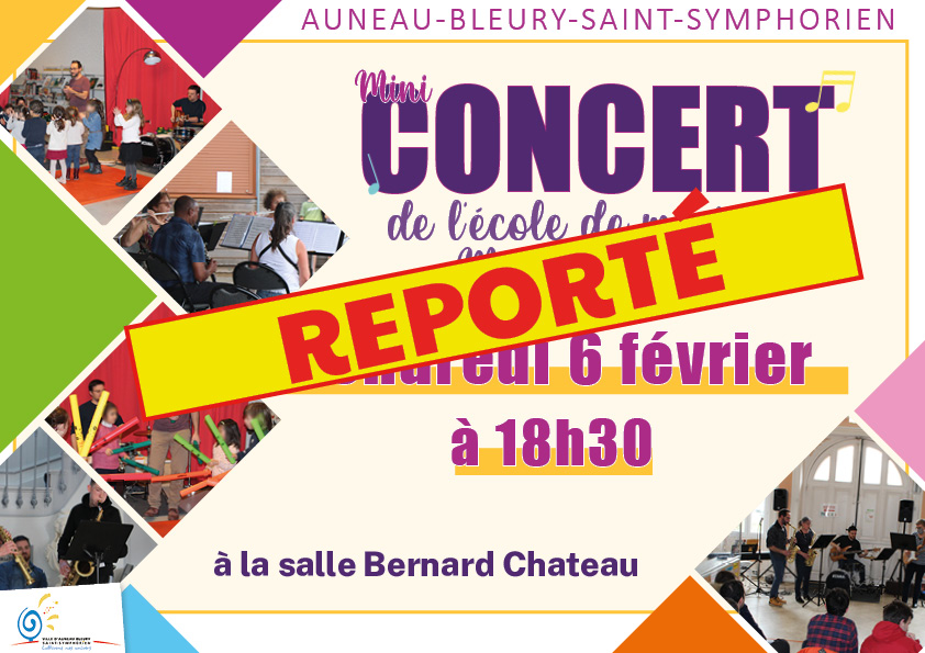 Evènements REPORTÉ - Mini-concert de l'école de musique REPORTÉ - Mini-concert de l'école de musique Auneau 0 Oui 0 € https://www.ville-ab2s.fr/fr/evenements/reporte-mini-concert-de-lecole-de-musique--686.html 06/02/2026 Le Mini-concert des élèves de l'école de musique prévue le vendredi 6 février à 18h30 à l'Espace Bernard Chateau de Bleury est REPORTÉ.