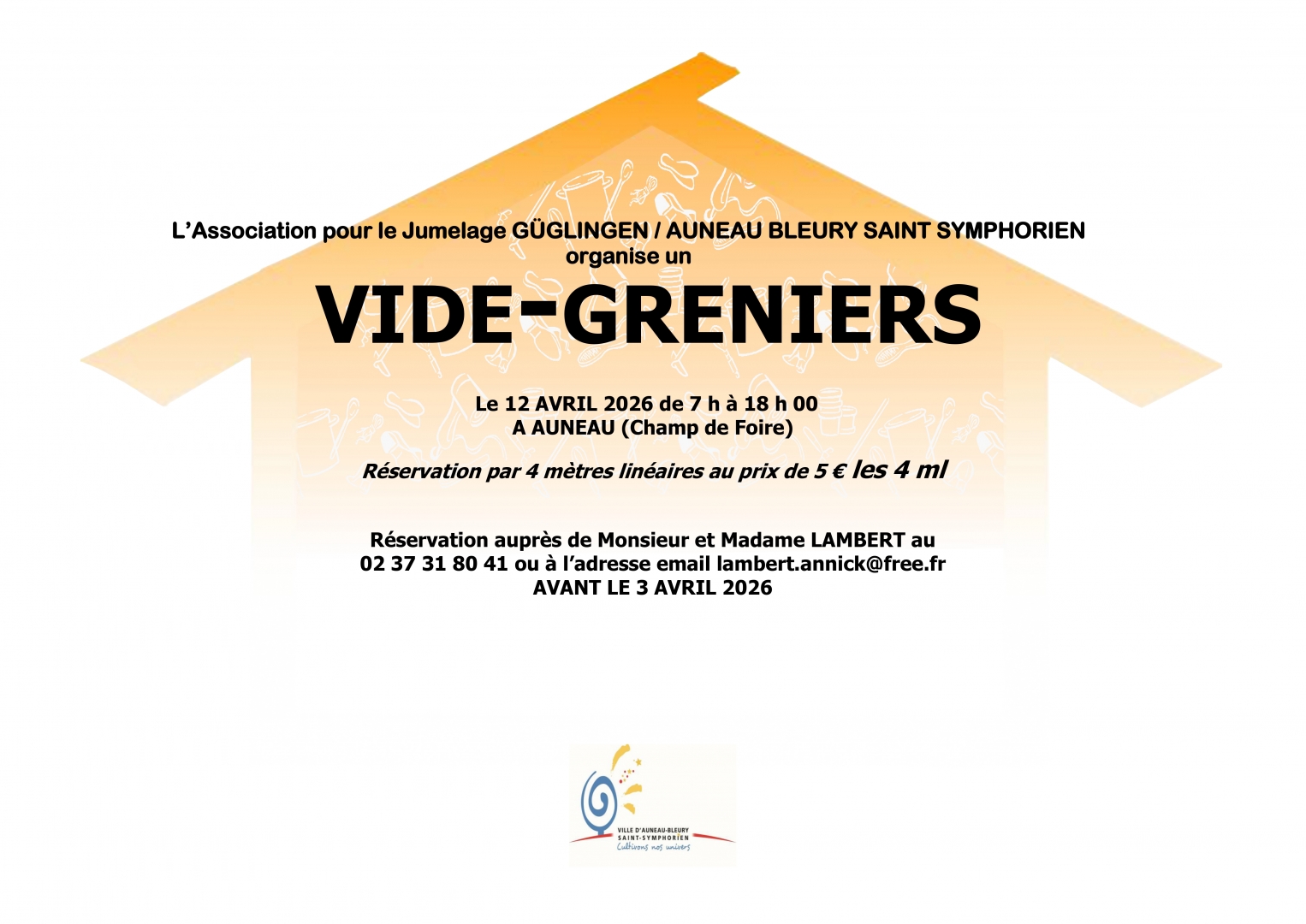 L'association pour le Jumelage Güglingen- Auneau-Bleury-Saint-Symphorien organise un vide-greniers le dimanche 12 avril de 7h à 18h place du Champ de Foire.